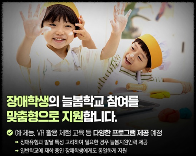 장애 학생의 늘봄학교 참여도 맞춤형으로 지원하고 있습니다. 예·체능, VR 활용 체험 교육 등 다양한 프로그램을 제공할 예정이며, 장애 유형과 발달 특성을 고려하여 필요한 경우 늘봄지원인력을 제공하고, 일반 학교에 재학 중인 장애 학생에게도 동일하게 지원합니다.