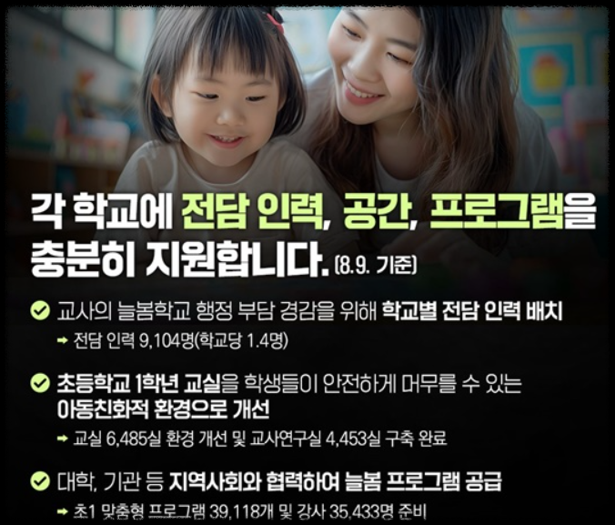 또한, 각 학교에 전담 인력, 공간, 프로그램을 충분히 지원하고 있습니다. 2023년 8월 9일 기준으로 교사의 늘봄학교 행정 부담 경감을 위해 학교별 전담 인력 9,104명(학교당 1.4명)을 배치했으며,