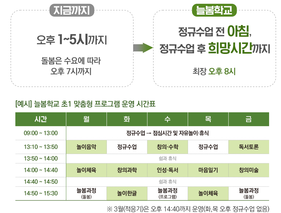 늘봄학교는 정규 수업이 끝난 이후에도 학생들이 학교에 남아 다양한 맞춤형 교육 프로그램과 돌봄 서비스를 받을 수 있도록 설계되었습니다.