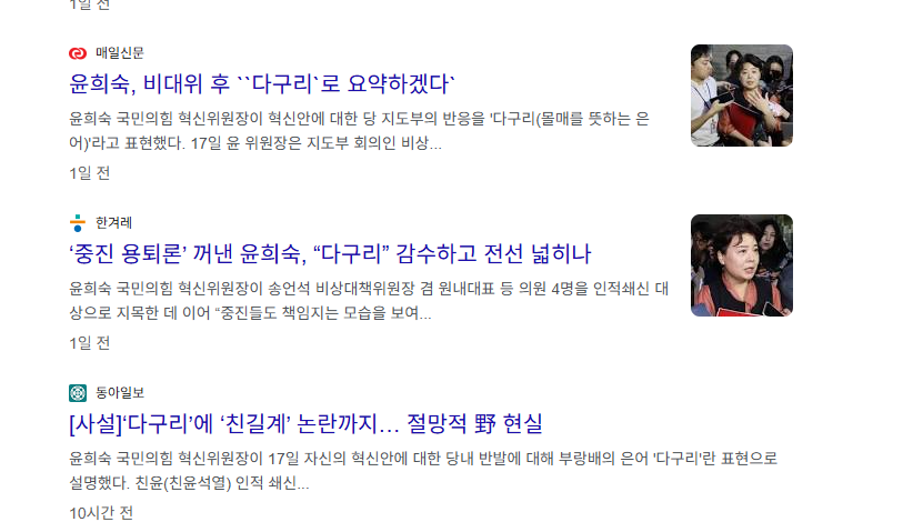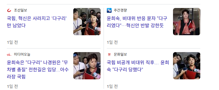 정리하면, 윤희숙이 “다구리”라는 표현을 쓴 배경은 본인이 제안한 인적쇄신안이 국민의힘 지도부와 당내 다수의 강한 반대로 집단적인 비판에 직면했음을 직접적이고 속어적인 방식으로 드러낸 것입니다. 이는 당 혁신 논의의 심각한 내홍과 갈등, 지도부와 혁신위 사이의 이견을 상징적으로 보여줍니다.