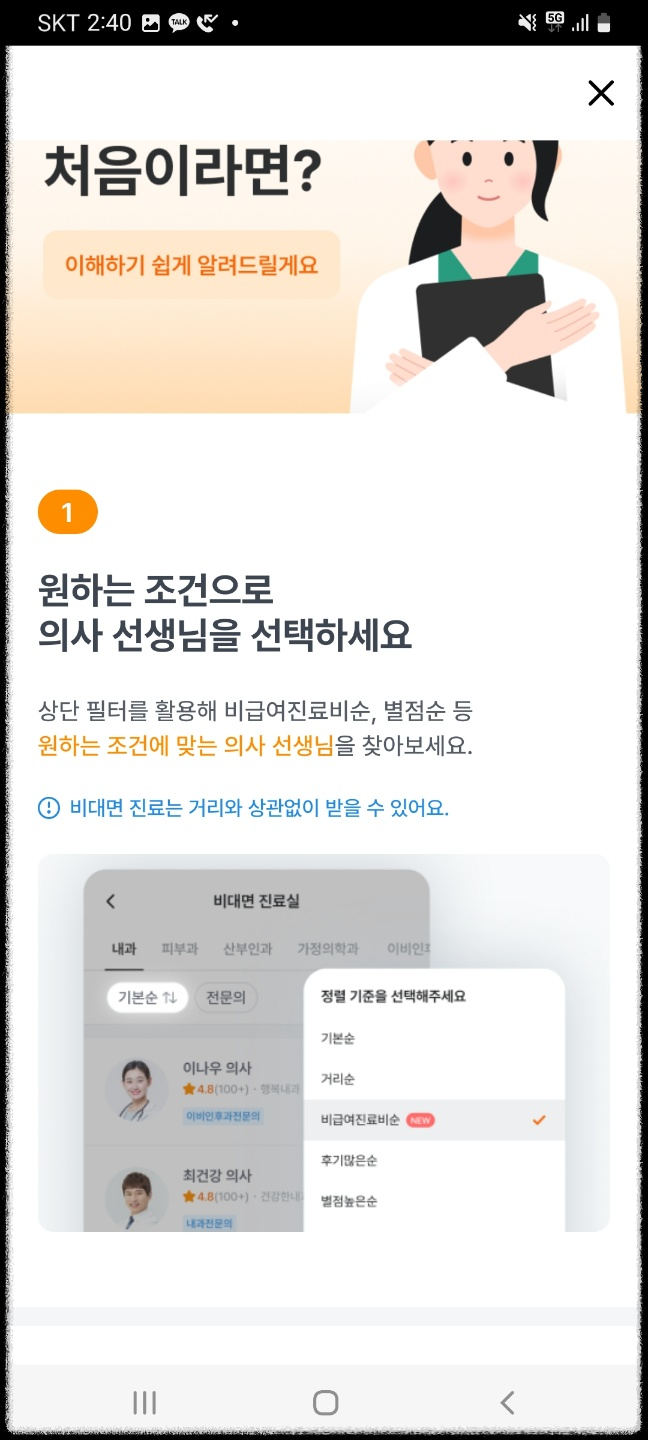 이때 빠른 예약순, 후기 많은 순, 별점 높은 순 등의 정렬 기준을 참고하여 적합한 의사를 고를 수 있습니다. 원하는 날짜와 시간대에 진료를 예약하고, 진료 신청서를 작성합니다.