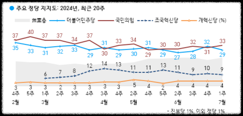 그 뒤로는 조국혁신당이 11.3%, 개혁신당이 3.2%, 진보당이 1.2%, 새로운미래가 1.0%를 기록했고, ‘지지정당 없음’은 5.8%였습니다.