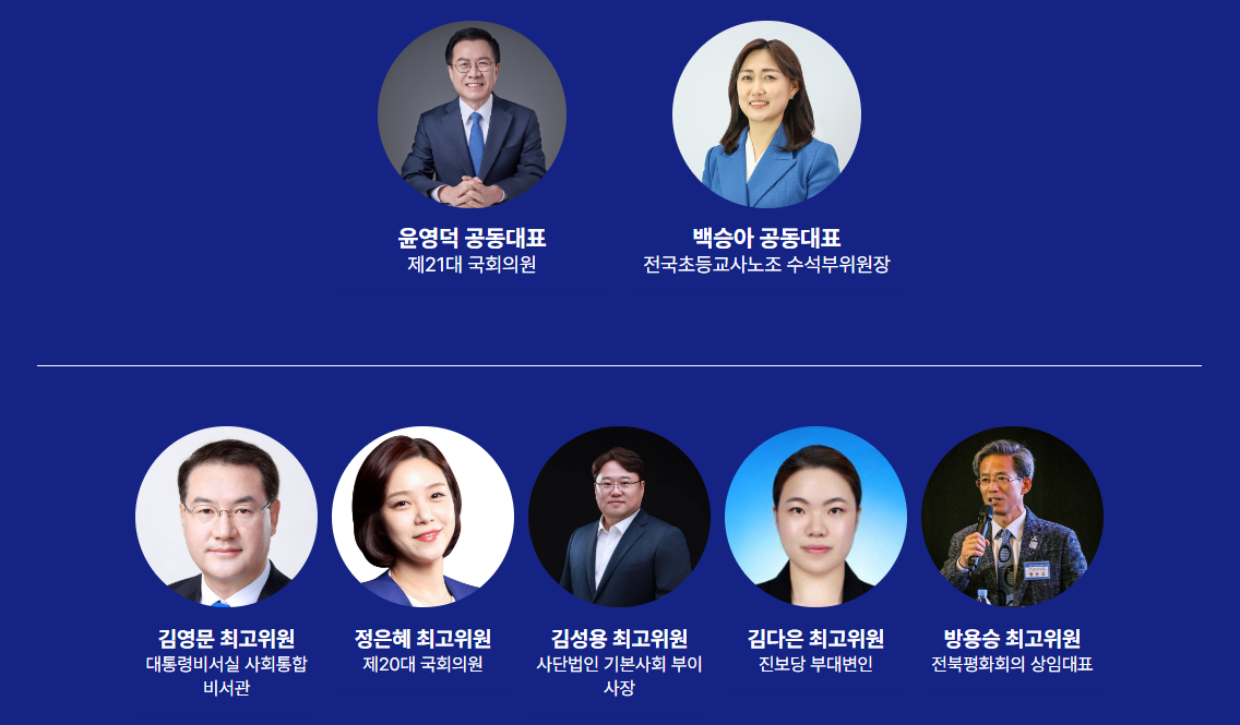 공동대표는 제21대 국회의원 윤영덕 공동대표, 전국초등교사노조 수석부위원장 백승아 공동대표가 맡았습니다. 여기에 김영문, 정은혜, 김성용, 김다은, 박용승등이 최고위원 지도부로 이루어져 있습니다.
