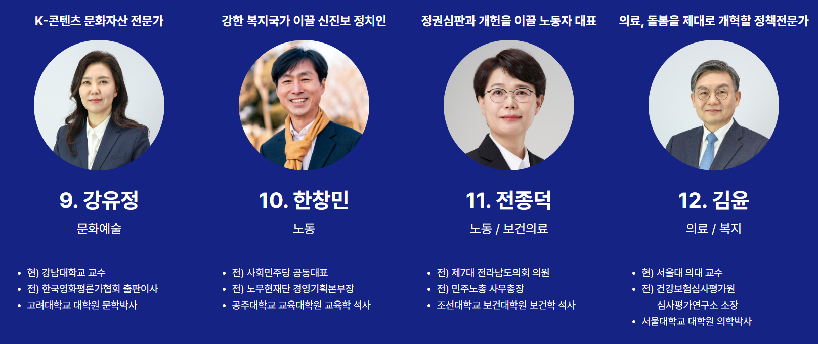 순번9번은 강유정 강남대 한영문화콘텐츠전공 교수입니다. 순번10번은 한창민 전 사회민주당 공동대표입니다. 순번11번은 전종덕 전 민주노총 사무총장입니다. 순번12번은 김윤 서울대 의료관리학교실 교수입니다.