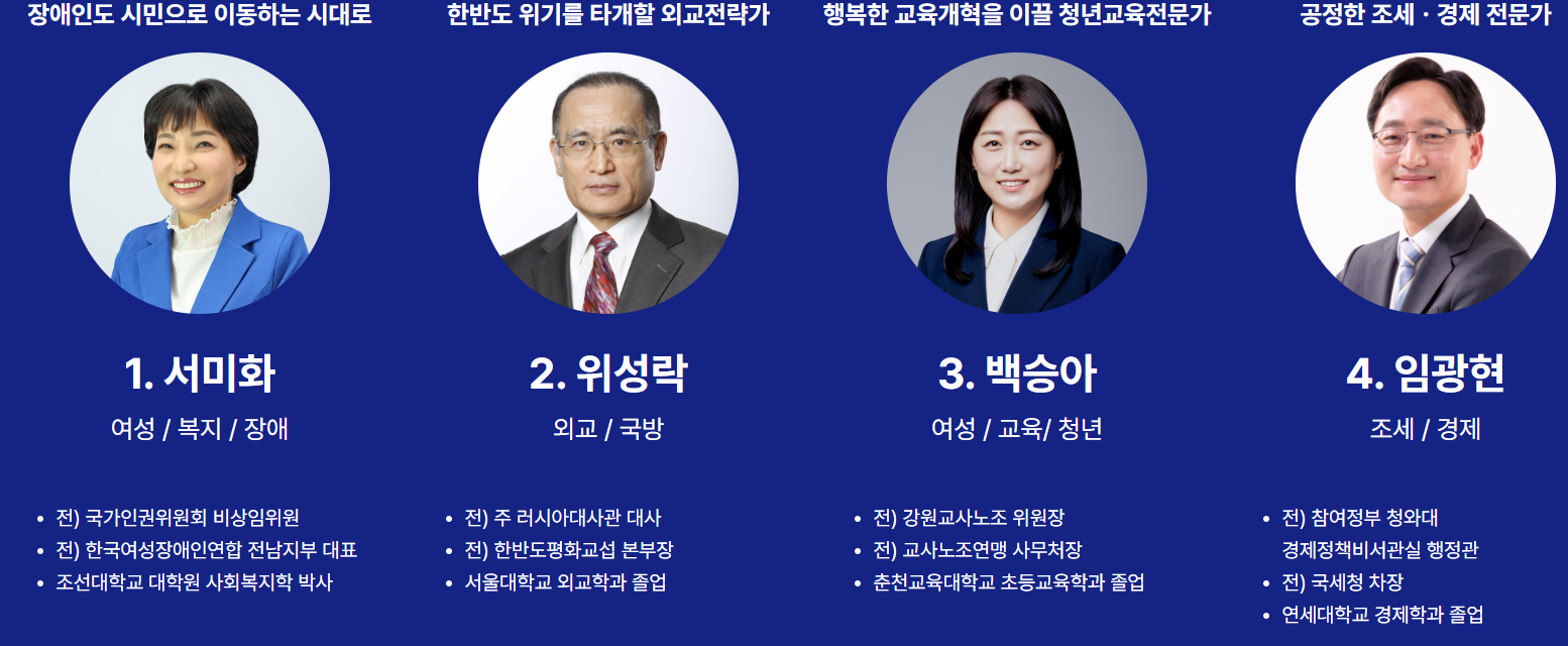 순번1번은 서미화 전 국가인권위원회 비상임위원입니다. 순번2번은 위성락 전 주러시아 대사입니다. 순번3번은 백승아 초등교사노조 수석부위원장입니다. 순번4번은 임광현 전 국세청 차장입니다.