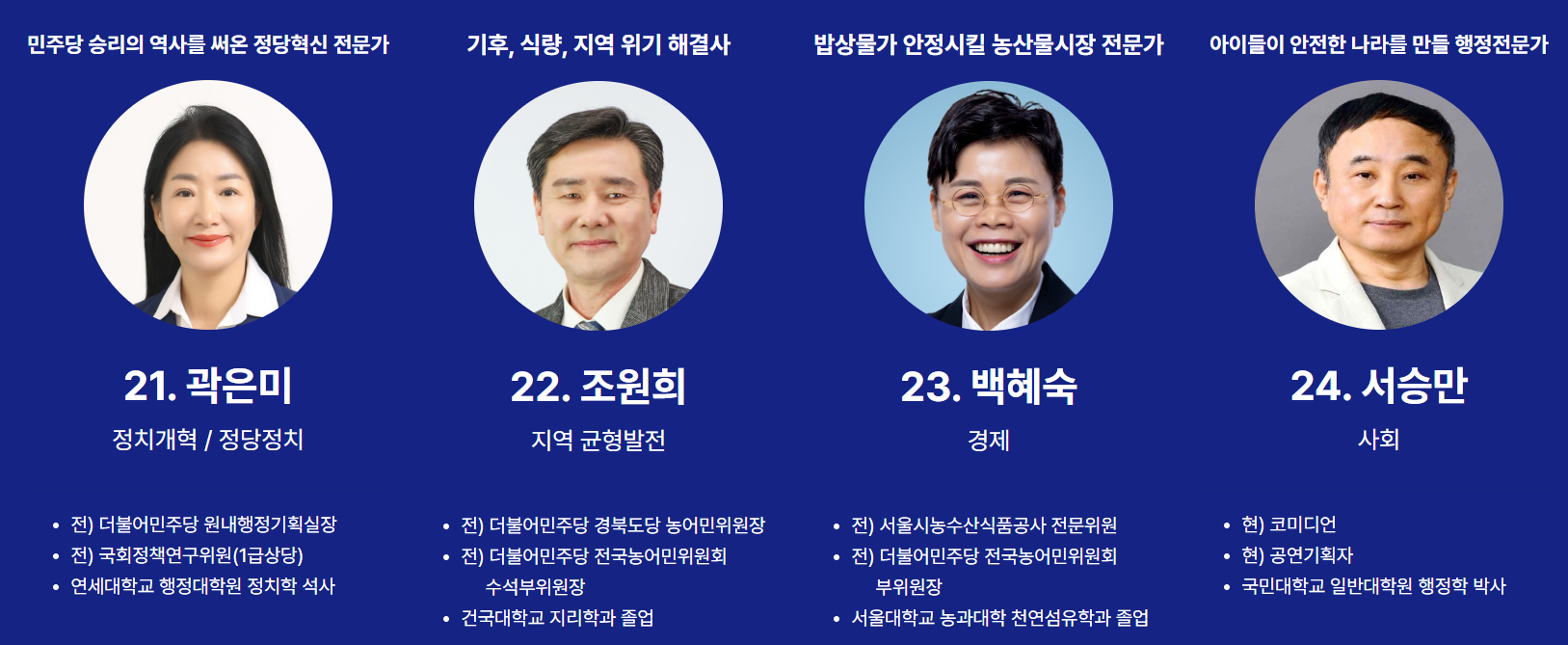 순번21번은 곽은미 전 민주당 국제국장입니다. 순번21번은 조원희 전 민주당 경북도당 농어민위원장입니다. 순번23번은 백혜숙 사회적기업 에코십일 대표입니다. 순번24번은 서승만 전 더민주전국혁신회의 공동대표입니다.