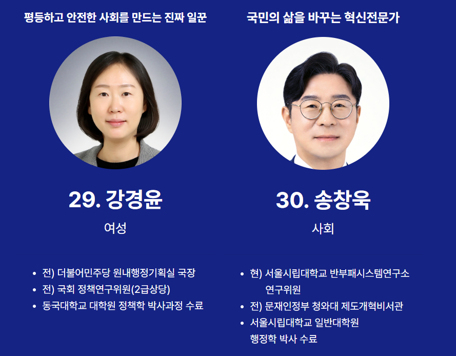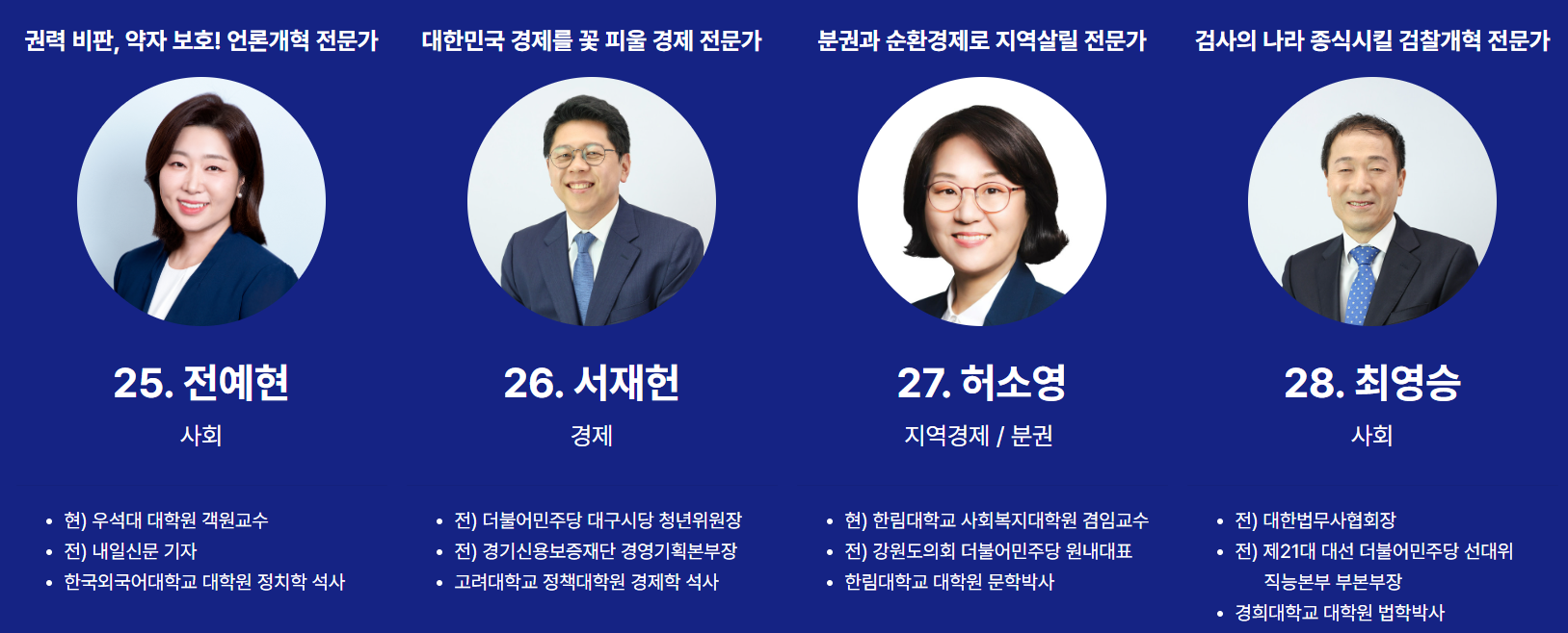 순번25번은 전예현 전 한국여성수련원장입니다. 순번26번은 서재헌 전 민주당 대구시당 청년위원장입니다. 순번27번은 허소영 전 강원도의원입니다. 순번28번은 최영승 전 대한법무사협회 회장입니다.