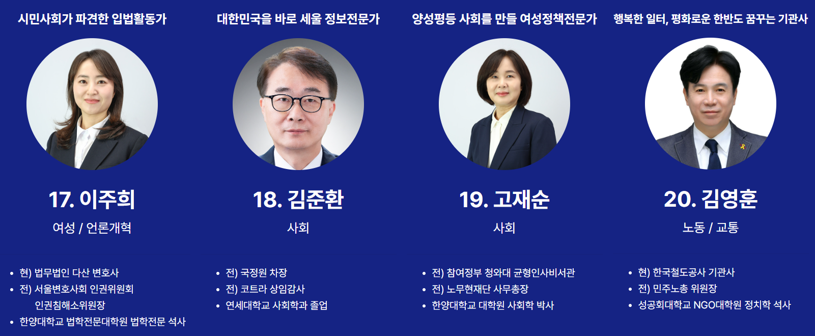순번17번은 이주희 법무법인 다산 변호사입니다. 순번18번은 김준환 전 국가정보원 제2차장입니다. 순번19번은 고재순 전 노무현재단 사무총장입니다. 순번20번은 김영훈 전 민주노총 위원장입니다.