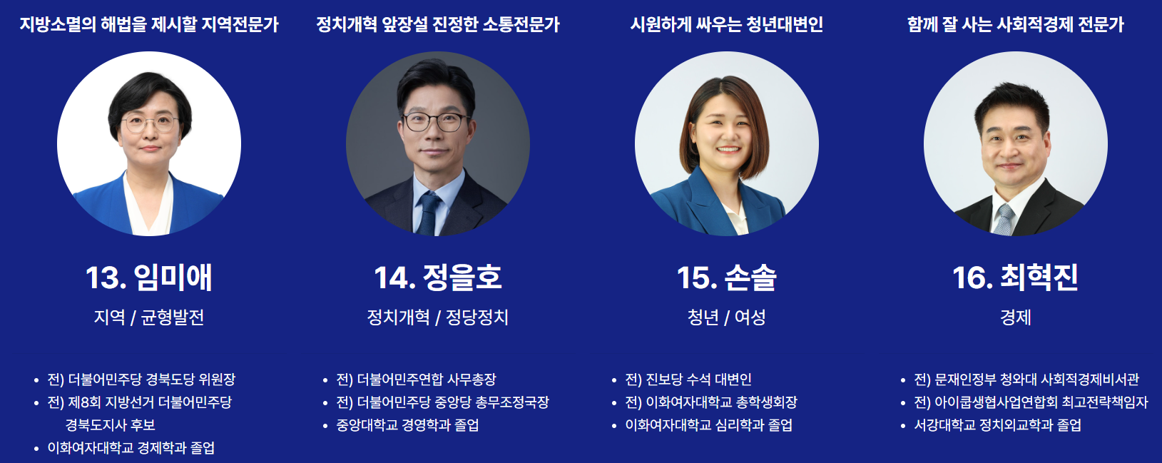 순번13번은 임미애 전 민주당 경북도당위원장입니다. 순번14번은 정을호 전 민주당 총무조정국장입니다. 순번15번은 손솔 전 진보당 수석대변인입니다. 순번16번은 최혁진 전 청와대 사회적경제비서관입니다.