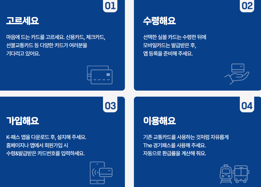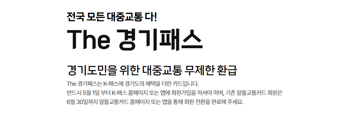 신청은 4월24일부터 가능하게 되었으며 카드는 1인당 1장만 등록이 가능합니다. 더경기패스를 이용하기 위해선 먼저 K패스 서비스를 신청해야 합니다. K-패스에 경기도민이 가입하면 더 경기패스가 되는 방식입니다.