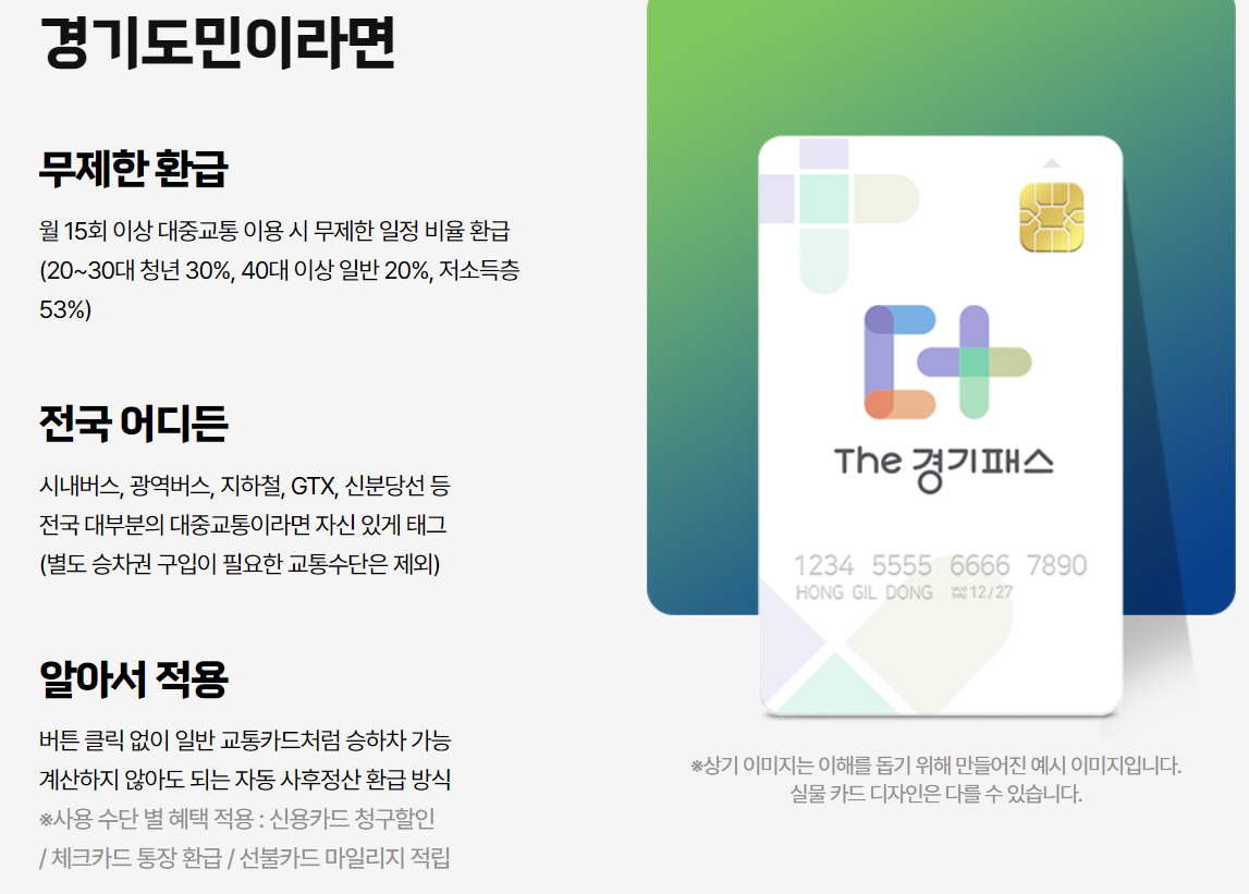 경기도민 교통비 부담 완화와 대중교통 이용 활성화를 위해서 맞춤형 교통비 지원 카드라고 보시면 됩니다. 성인들이 대중교통을 저렴하게 이용할 수 있도록 고안되었습니다.