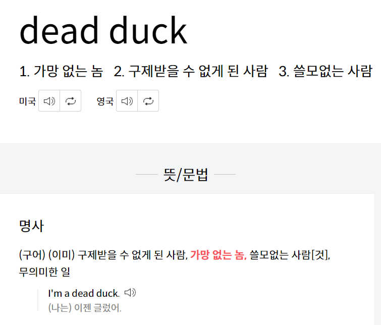 데드덕이란 영어로 dead duck으로 표기됩니다. 사전적 의미로는 가망없는 놈, 구제받을수 없게 된 사람, 쓸모없는 사람 또는 죽은 오리라는 뜻을 지난 명사입니다. dead는 죽음 그리고 duck은 오리의 표현입니다.