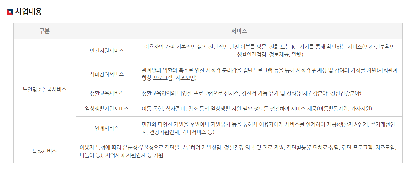 이외에 보다 상세한 정보는 아래의 노인맞춤돌봄 서비스 배움터를 참고해 보시기 바랍니다.
