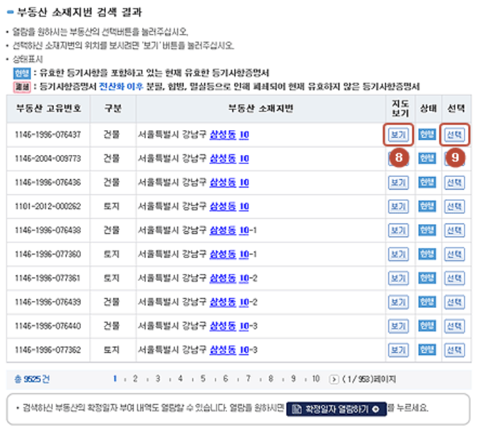 현행과 폐쇄 모두 조회 검색도 가능합니다. 공동담보/전세목록, 매매목록도 선택하면 함께 열람이 가능합니다. 부동산 소재지번의 위치를 확인하실 수 있으며 열람을 선택합니다.