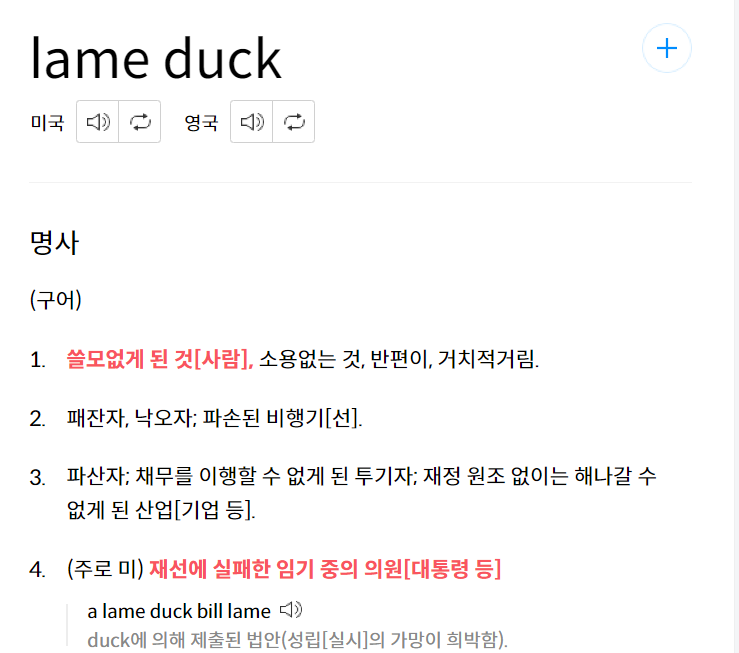 영어로는 lame duck으로 표기하며 레임(lame)의 뜻은 절름발이의, 서투른, 불충분한이라는 의미를 가지고 있는 형용사입니다.