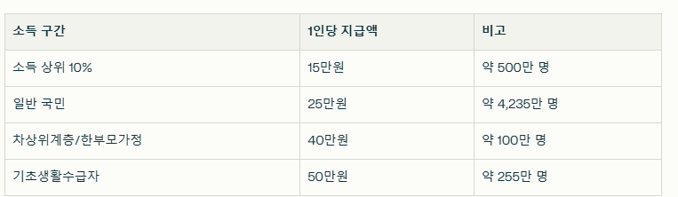 현재 까지 정보를 요약하자면, 2025년 민생회복지원금은 전국민을 대상으로 하되, 소득 수준에 따라 1인당 15만원에서 최대 50만원까지 차등 지급하는 방안이 유력하게 검토되고 있습니다.