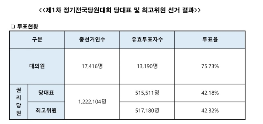 전당대회의 투표율은 42.18%로, 2021년 전당대회에 이어 두 번째로 높은 기록을 세웠습니다. 특히 최고위원의 경우 전당대회 하루 전까지 당선자의 윤곽이 드러나지 않았고, 마지막 날 최고위원 순위가 뒤바뀌는 등 흥미로운 전개로 많은 관심을 모았습니다.