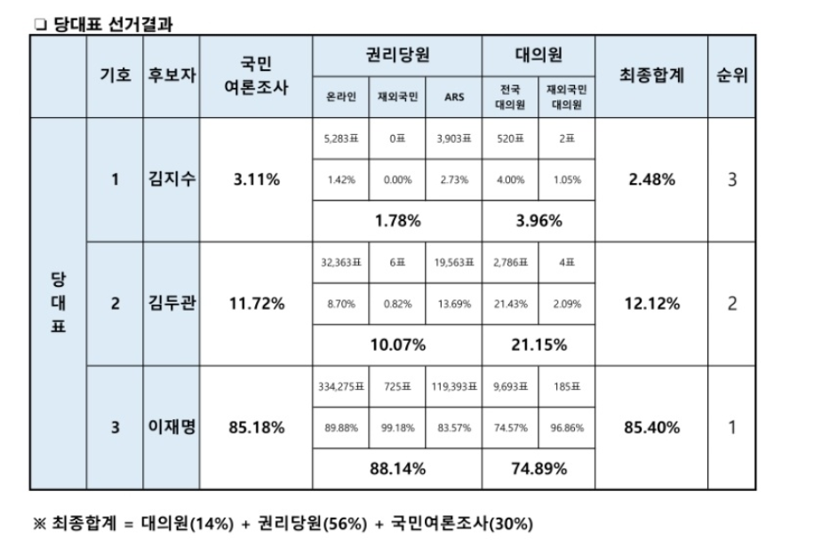 대의원 투표 비율이 14%로 감소하고, 국민여론조사 비율이 30%로 증가하면서 역전의 가능성이 사라진 상황에서 이재명의 대세론이 확고히 입증되었습니다.