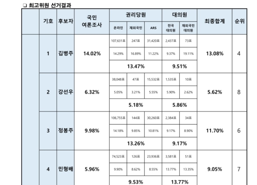 최종 순위는 순서대로 1위 김민석 후보 18.23%, 2위 전현희 후보 15.88%, 3위 한준호 후보 14.14%, 4위 김병주 후보 13.08%, 5위 이언주 후보 12.30%를 득표하며 최고위원에 선출 되었습니다. 정봉주, 민형배, 강선우 후보는 당선권에 들지 못하며 탈락의 고배를 마셨습니다.