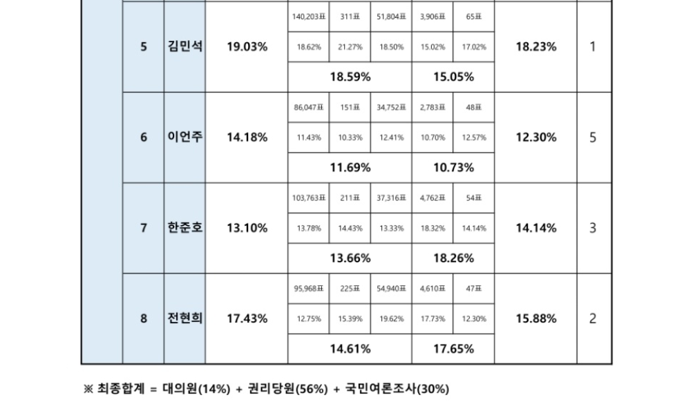 반면 전현희는 전당대회 종료 직전 단 이틀 만에 급상승하여 차석으로 뛰어오르는 반전 드라마를 연출했습니다.