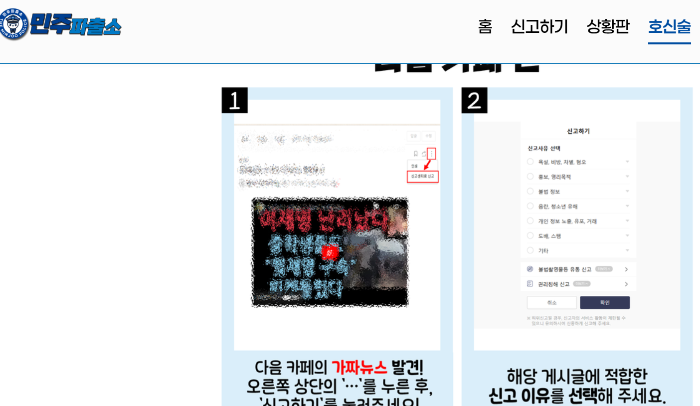 상황판에서는 현재의 여러 가짜뉴스에 대해 안내하고 호신술탭에서는 가짜뉴스 신고방법을 플랫폼 별로 안내중입니다.