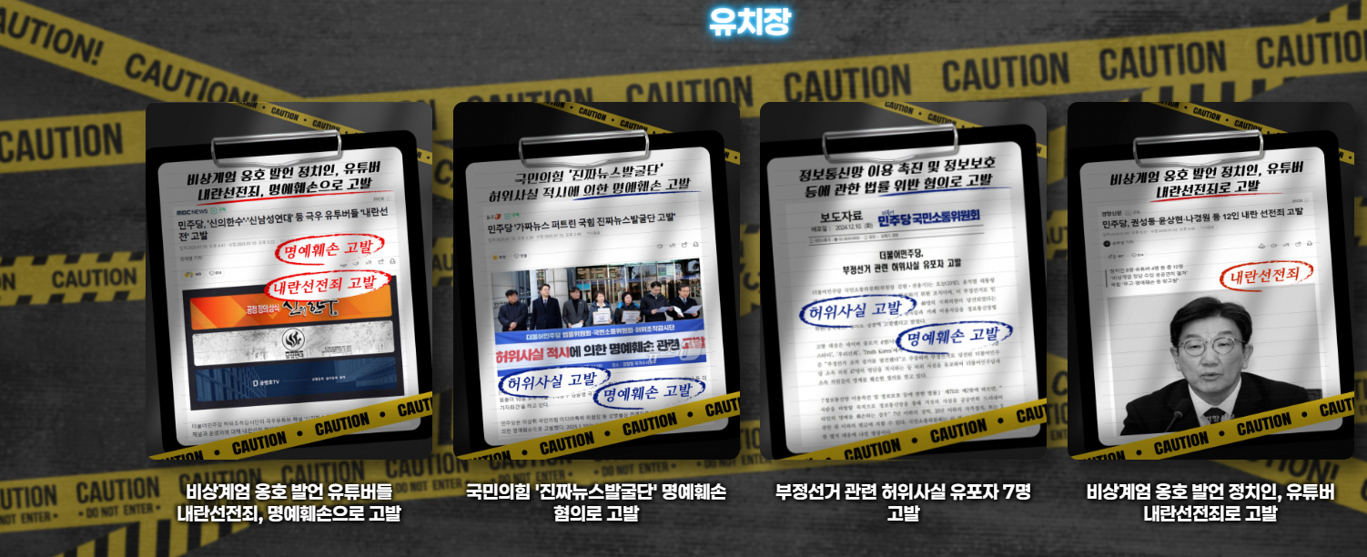 신고된 허위 정보를 퍼뜨린 사람들을 특정하면 '유치장'이라는 탭에 이를 게시하고 있습니다. '유치장'에는 권성동 국민의힘 원내대표의 사진이 게시되었으며, 이는 윤석열 대통령 탄핵과 관련된 허위 정보 유포와 관련이 있다고 판단된 것입니다. 이를 통하여 확정된 판결등에 대해 교도소라는 탭으로 이동하는 것으로 보입니다.