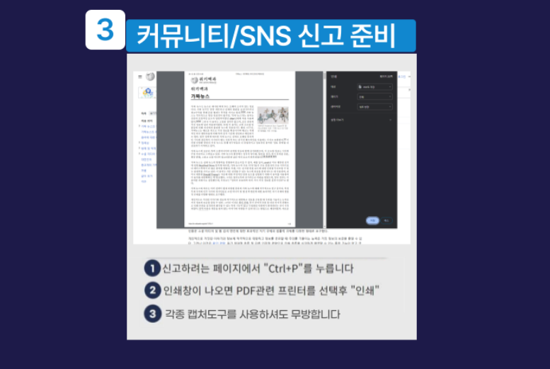 특히, 캡처한 화면은 전체 스크린샷으로, 단톡방이나 문자 캡처에는 방 이름과 발신인 정보가 포함되도록 요구하고 있습니다. 또한, 영상 신고 시 특정 구간의 시간도 기입해야 합니다. 커뮤니티와 SNS에 대한 신고는 PDF 형식으로 저장하여 업로드해야 합니다.