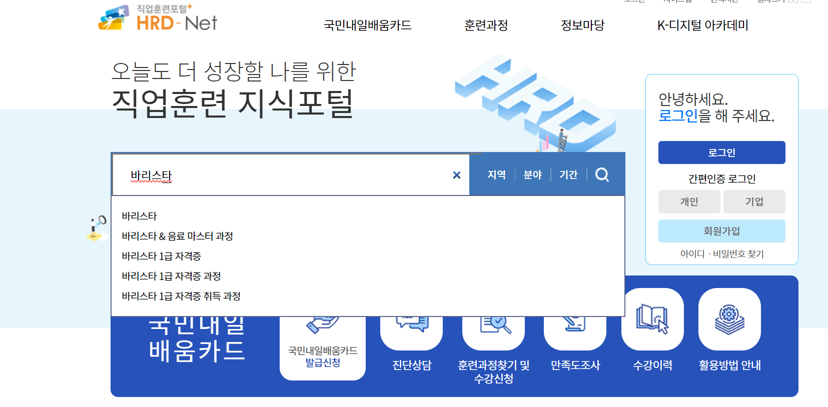 국비지원을 통해서도 배울수가 있는데 바로 내일배움카드를 활용하는 것입니다. 내일배움카드를 통해서 교육을 받으시게 된다면 교육비의 약 50% 정도를 지원받고 나머지 금액을 자기 부담금으로 처리하시면 됩니다. 정부에서 운영하는 HDR 직업훈련포털에서 검색해 보시고 바리스타 자격증 학원등을 참고해 보시기 바랍니다.