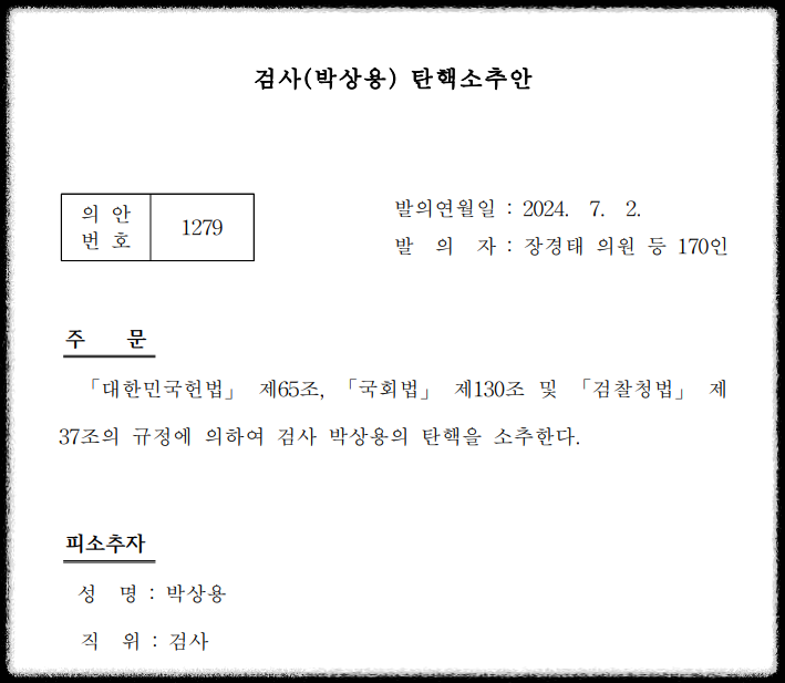 민주당은 앞서 이화영 술자리 회유 의혹과 관련하여 헌법적 책임을 묻겠다며 탄핵소추안을 발의하였습니다. 박검사는 쌍방울 대북 송금 사건을 수사하였다가 추후 탄핵 대상이 되었습니다.