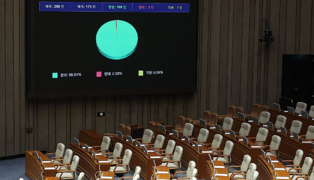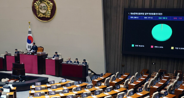 방문진법 개정안은 2025년 8월 21일 국회 본회의에서 재적 의원 171명 중 찬성 169명, 반대 1명, 기권 1명으로 압도적인 찬성에 힘입어 가결되어 통과되었습니다.