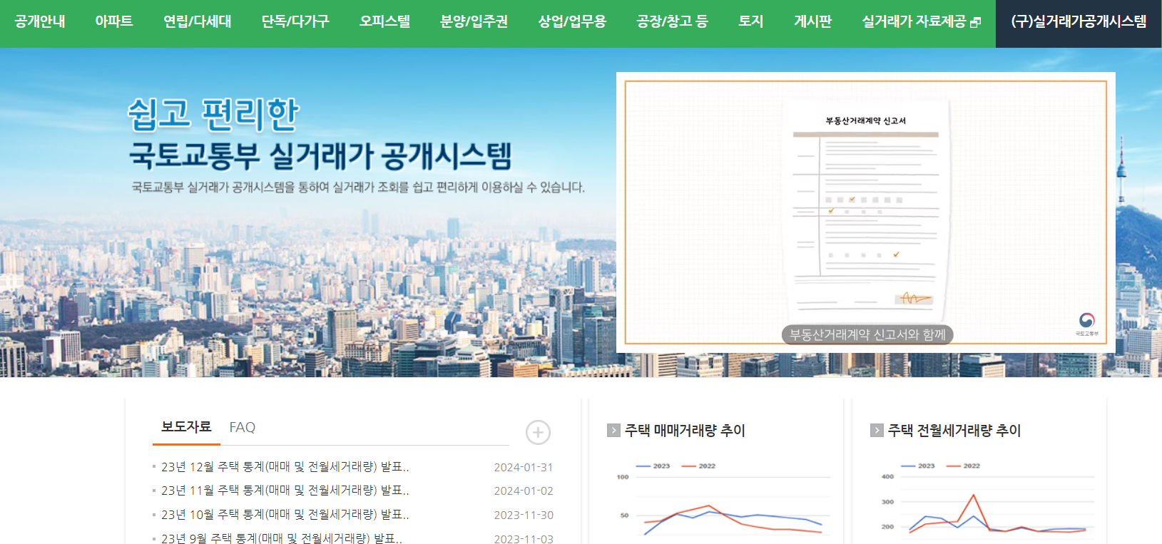 아파트, 연립 다세대, 상업 업무용등 부동산의 종류에 따라서 지역별로 실거래가를 조회해 보고자 하실때에 유용합니다. 홈페이지에 접속하신후에 우측상단에 실거래가 자료제공으로 이동합니다.