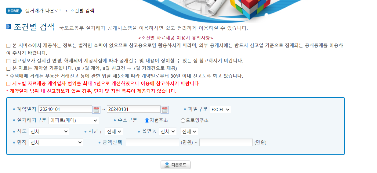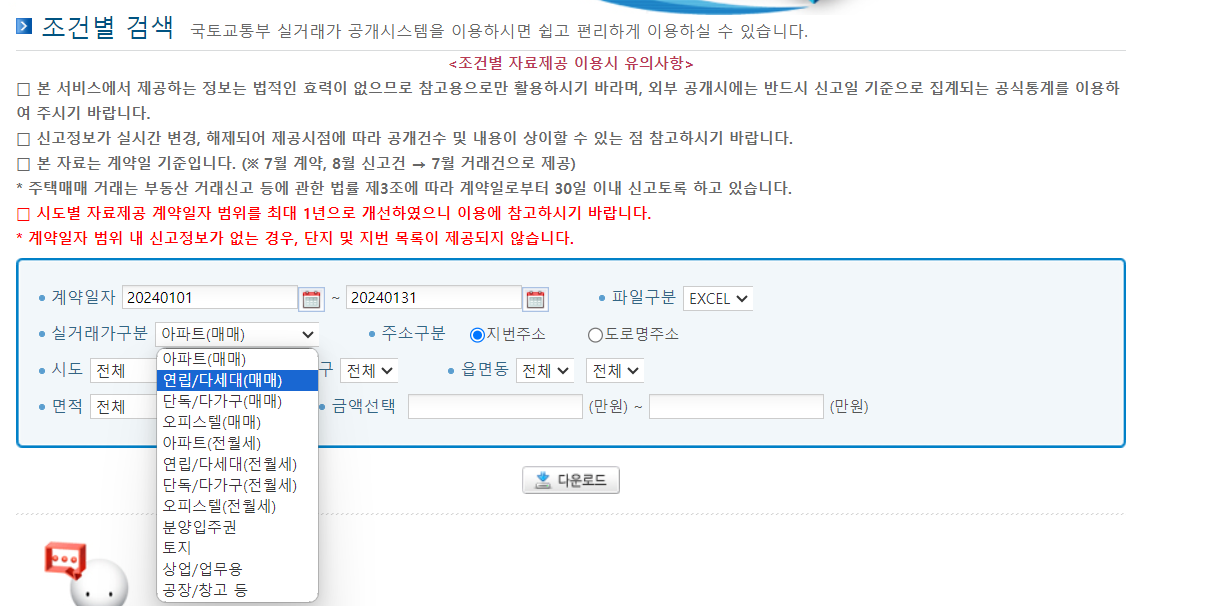 아파트 매매부터 공장 창고등 원하시는 조건에 맞게 필터링하여 조회해 보실수 있습니다. 입력을 모두 마치신후에 다운로드를 통하여 파일로 활용하실수도 있습니다.