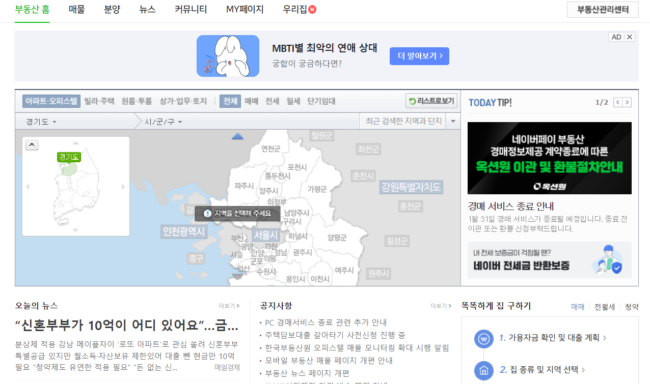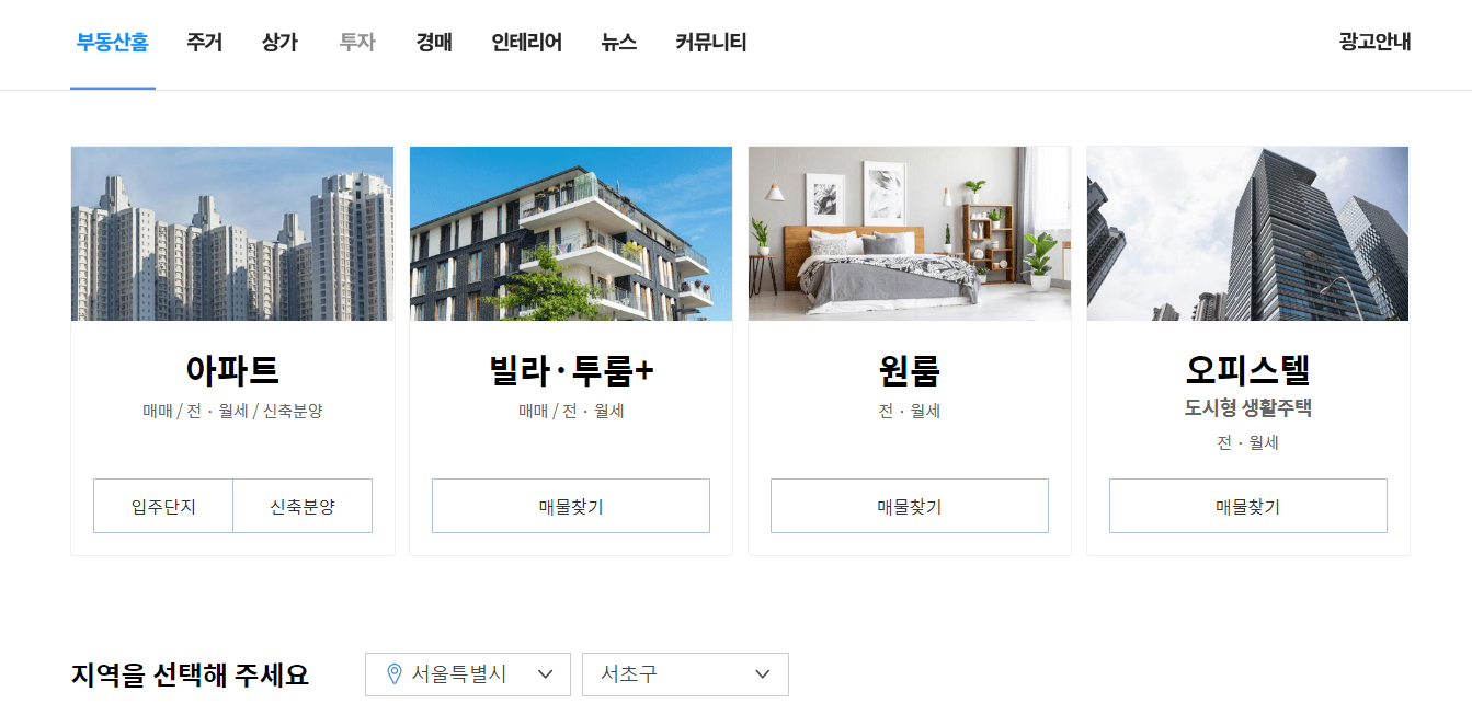 다음으로는 전국민이 가장 많이 이용하는 포털인 네이버에서 운영하는 부동산 플랫폼입니다. 매물탐색이 편리한 인터페이스로 구성되어져 있어서 복잡하기 않게 정보를 확인하기에 좋습니다.