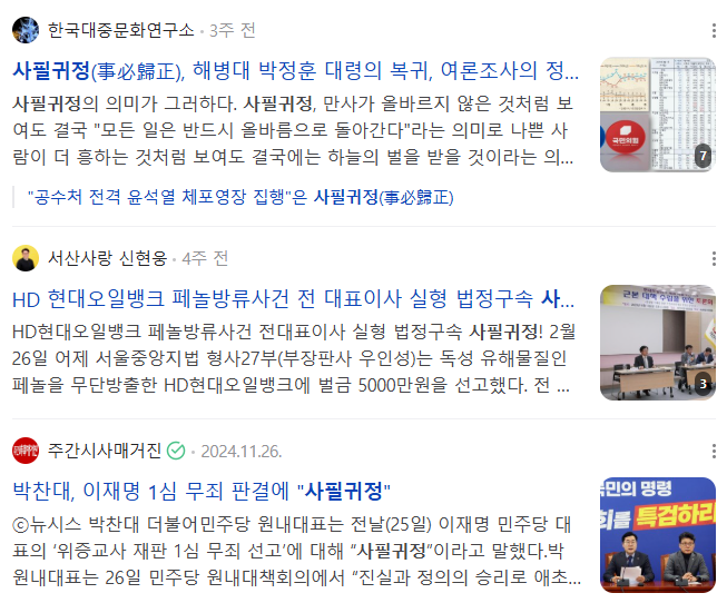 결론적으로 '사필귀정'은 정치, 법조, 언론, 일상생활 등 다양한 영역에서 사용되지만, 특히 정치권에서 빈번하게 사용되는 표현입니다.