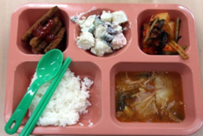 점심에는 된장찌개, 달걀찜, 오이양파무침, 배추김치 등 한식 위주의 반찬이 제공되며, 저녁에는 콩나물국이나 버섯매운국, 불고기류, 고추, 쌈장, 배추김치 등이 나옵니다.