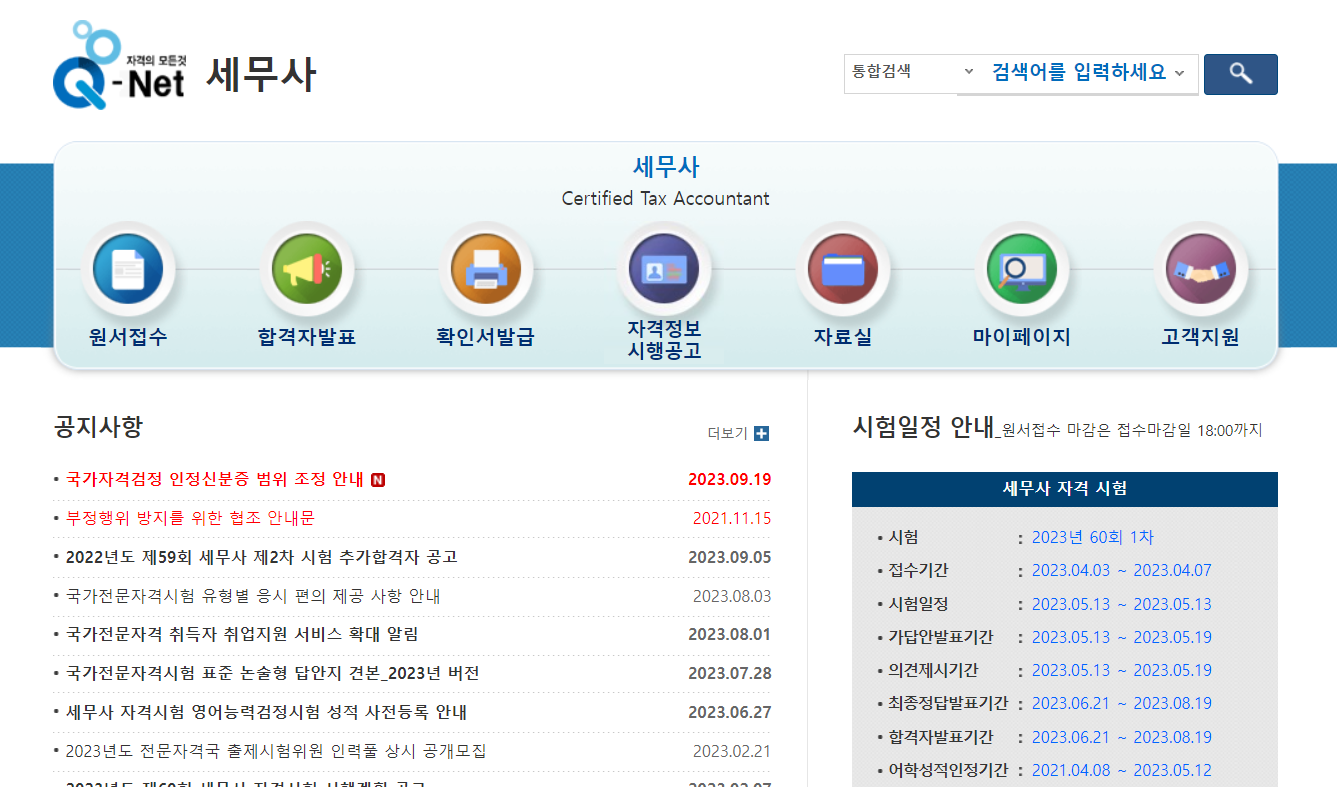 세무사 시험일정과 접수및 합격자 발표등은 모두 한국산업인력공단인 큐넷을 통해서 확인해 보시고 접수할 수 있습니다.