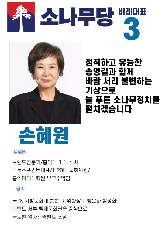 비례대표 3번은 손혜원 전 의원입니다. 1955년생으로 올해 69세의 나이이며 홍익대학교 공예도안과 염색공예 석사 졸업하고 크로스포인트 인터내셔널 고문등으로 활동한 경력이 있는 디자이너 출신입니다.