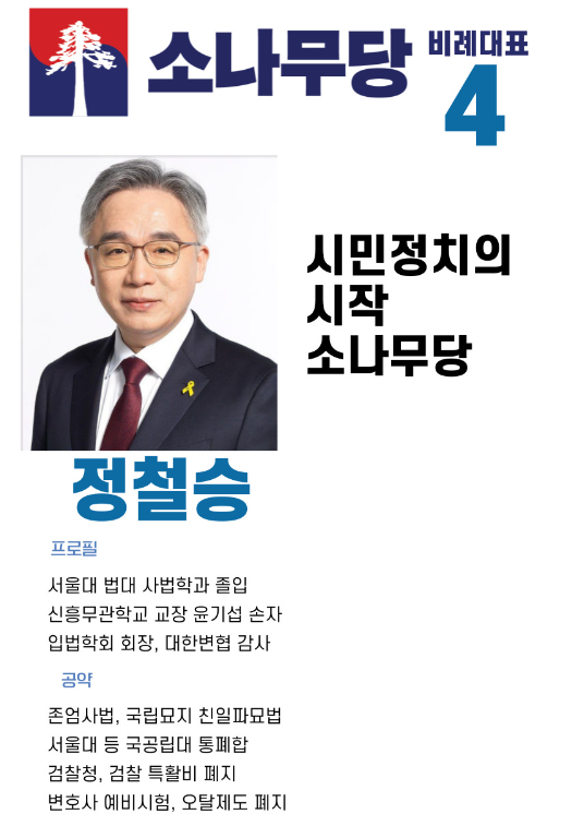 비례대표 4번은 정철승 변호사입니다. 1970년생으로 올해 53세의 나이이며 서울대학교 법과대학 사법학과 졸업하였고 한국입법학회 회장등을 지낸바 있습니다.