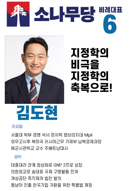 비례대표 6번은 김도현 전 주베트남 대사입니다. 1966년생으로 올해 57세의 나이입니다. 서울대학교 대학원 정치학과 정치학전공 석사 졸업하고 삼성전자 글로벌협력그룹장 임원으로 근무한 이력이 있는 경영컨설턴트입니다.