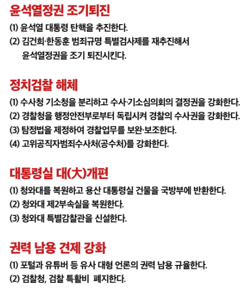 주요정책으로는 윤석열 대통령 탄핵 추진, 검찰 개혁 탐정법을 제정하여 탐정 양성화와 경찰 보조 업무 부여, 청와대 특별감찰관 신설 및 복구 및 집무실 기능 복귀,