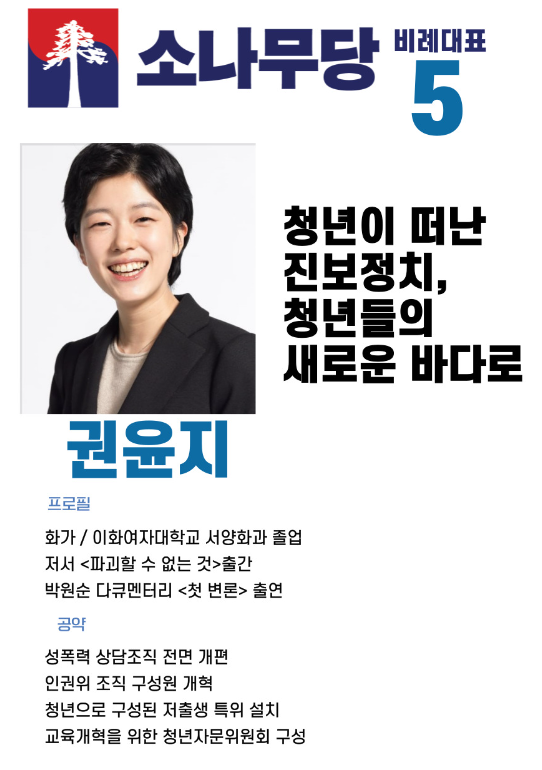 비례대표 5번은 권윤지 작가입니다. 1996년생으로 올해 27세의 나이이며 이화여자대학교 조형예술대학 서양화 졸업하고 작가로 활동하여 왔습니다.
