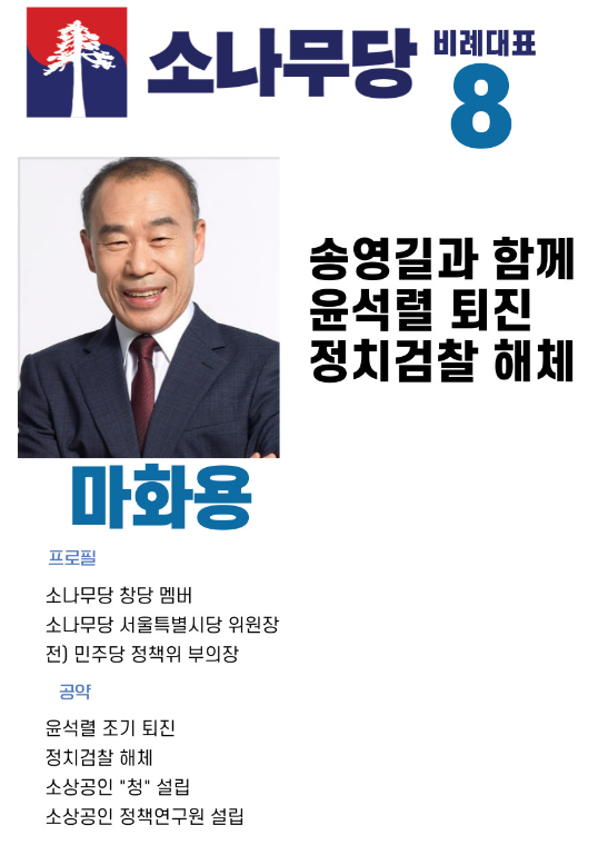비례대표 8번은 마화용 전 민주당 전국소상공인위원회 정책자문위원입니다. 1961년생으로 올해 63세의 나이이입니다.