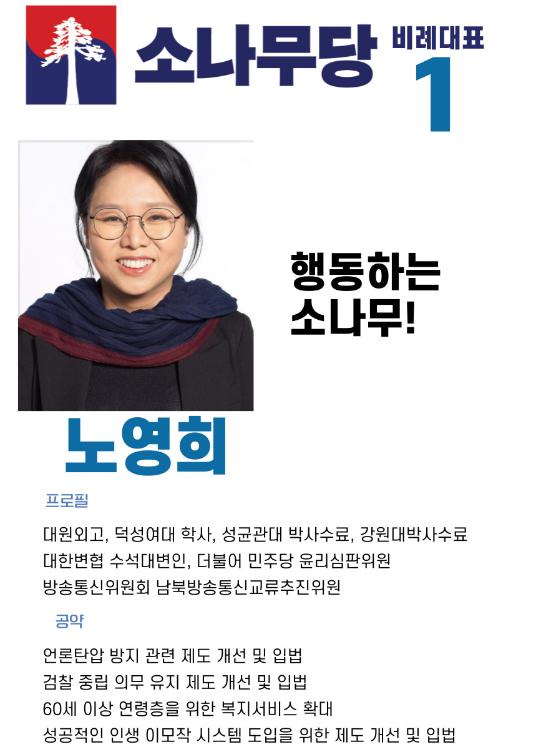 다음으로 소나무당 비례대표 명단 및 순번과 인물정보를 살펴보겠습니다. 비례대표 1번은 노영희 변호사입니다. 여러 방송매체를 통하여 얼굴이 잘 알려진 인물이기도 합니다.