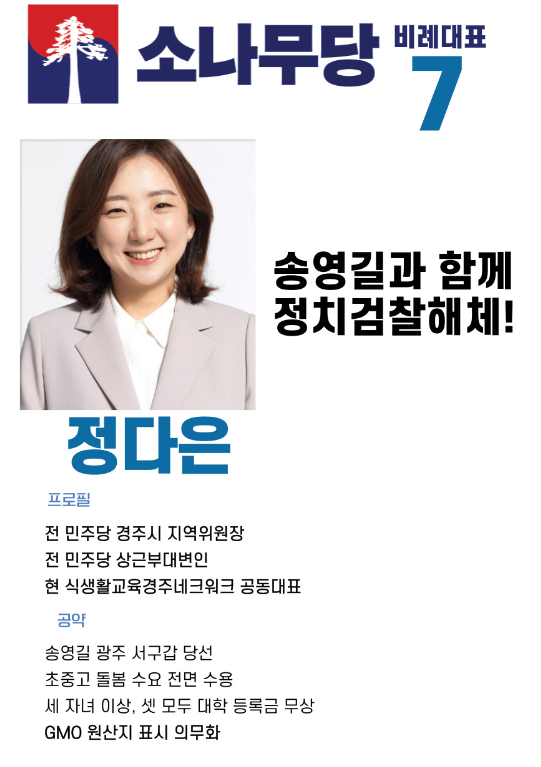 비례대표 7번은 정다은 전 민주당 상근부대변인입니다. 1986년생으로 올해 37세의 나이이며 부산대학교 행정학과 졸업를 졸업하고 더불어민주당 상근부대변인등으로 활동한 경력이 있습니다.