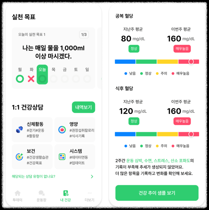 건강 상태 변화 추이를 한눈에 파악하고, 개선이 필요한 부분을 확인할 수 있습니다. 인공지능(AI) 기반 건강 위험 예측 기능을 통해 질병 예방에도 도움을 줍니다. 다음으로 맞춤형 건강 코치입니다.