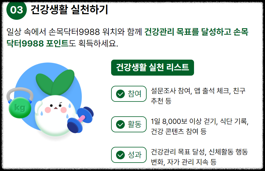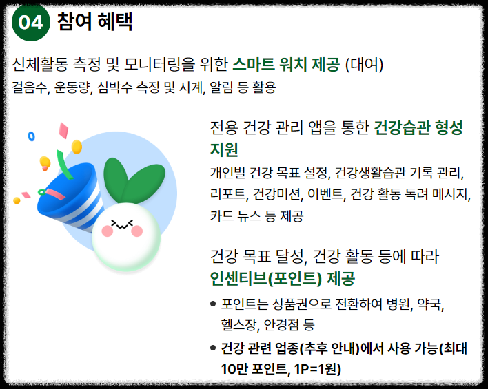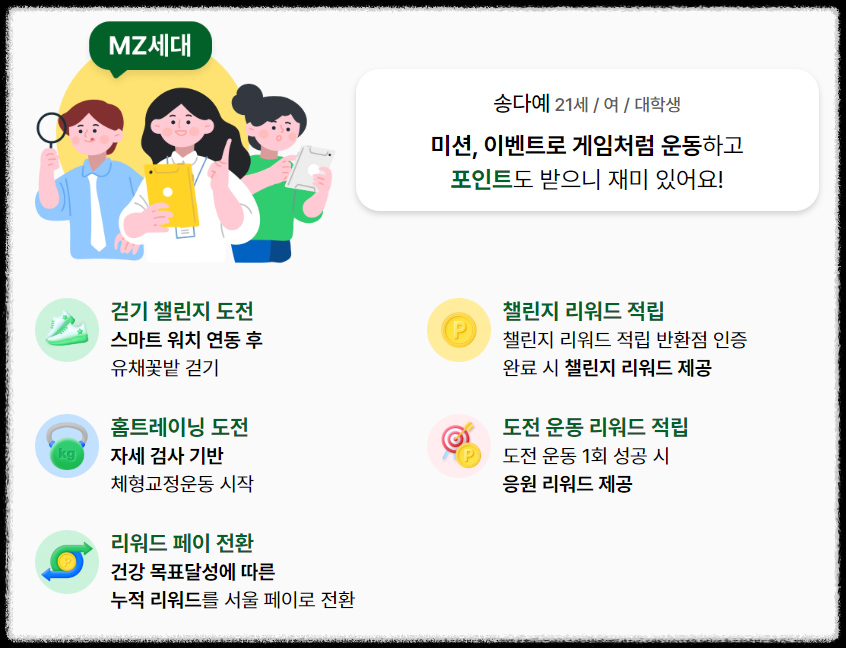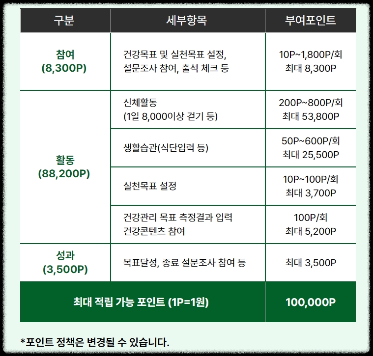 그리고 건강 활동 참여도에 따라 포인트를 적립하고, 이를 통해 다양한 혜택을 누릴 수 있습니다.