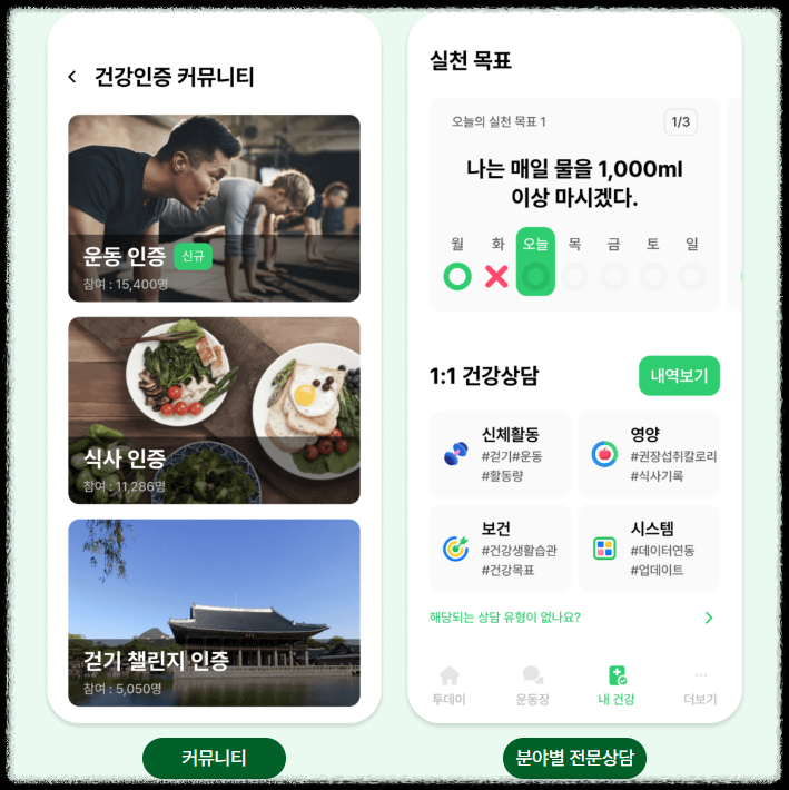 함께 건강 목표를 설정하고, 서로 응원하며 건강 습관을 만들어 갈 수 있습니다. 다양한 건강 관련 이벤트 및 정보를 통해 건강 관리에 대한 흥미를 높여줍니다.