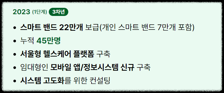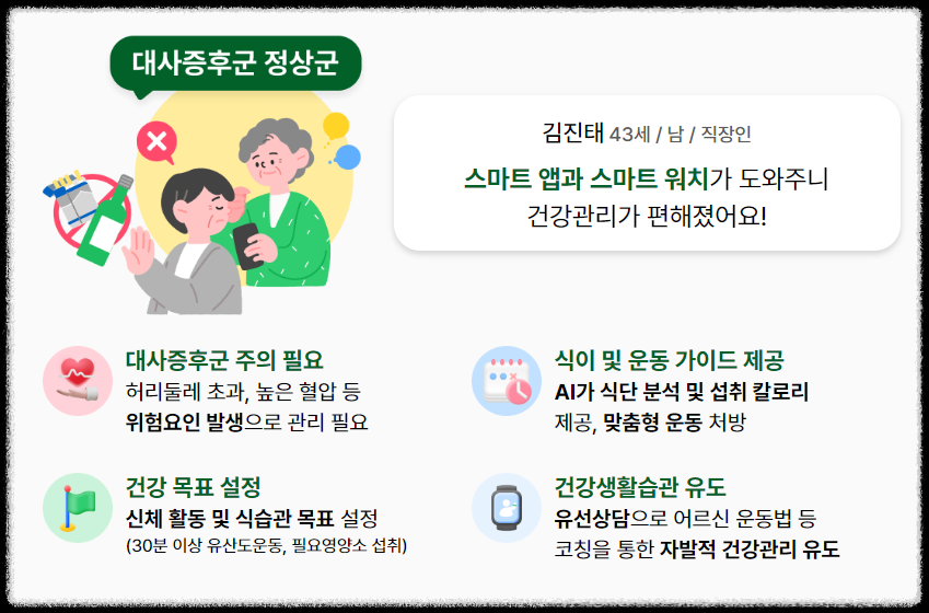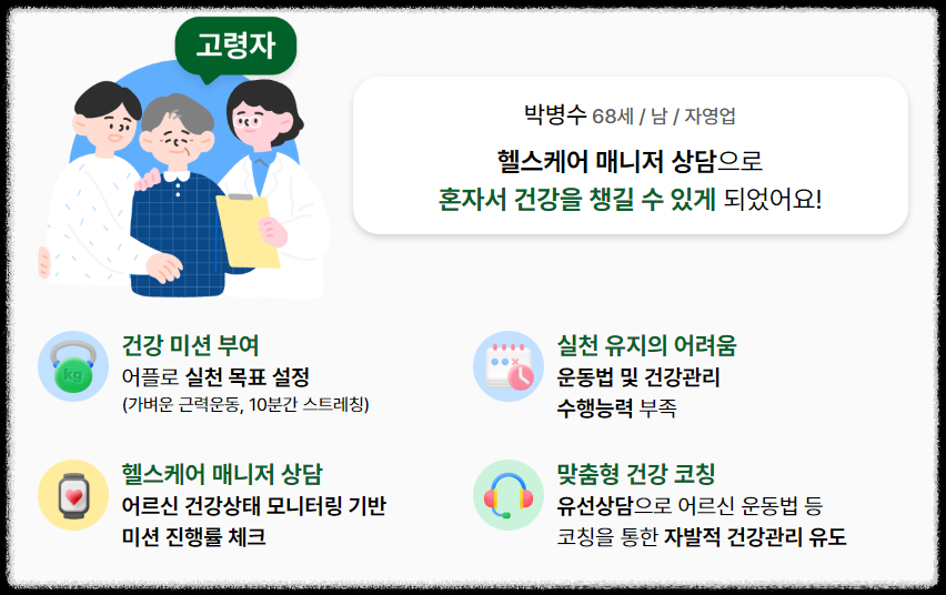 그리고 고령층의 경우 스마트폰이나 앱 사용에 어려움을 느낄 수 있습니다. 스마트워치 사용법이나 앱 기능 활용에 대한 교육 및 지원이 강화되었으면 좋겠습니다.