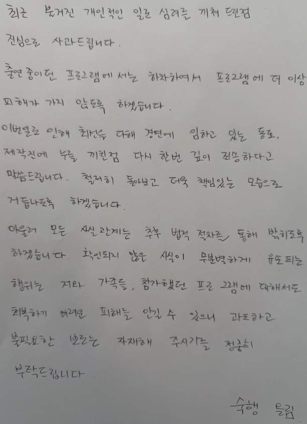 논란이 이어지자 결국 본인은 사과문을 공개했고, 당시 출연 중이던 방송 프로그램에서 자진 하차하겠다는 뜻을 밝혔습니다. 이 결정은 사태 수습을 위한 조치로 해석되며 대중의 이목을 다시 한 번 집중시켰습니다.