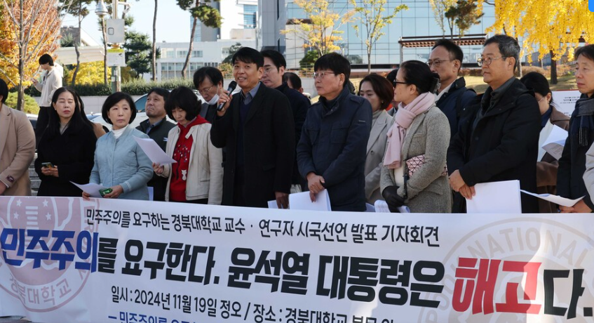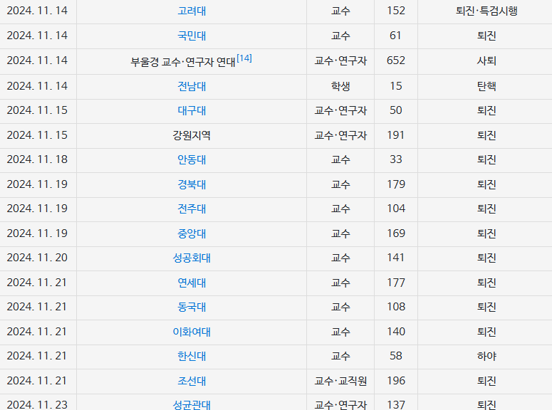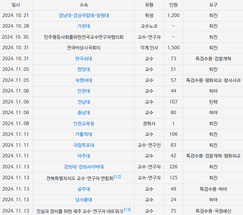 2024년 10월 이후로는 윤석열 정부를 비판하는 시국선언이 잇따라 발표되었습니다. 종교대학 중 개신교계 미션스쿨인 연세대학교는 구약성경 중 미가 2장 1절, 3절의 말씀을 인용하였으며 조계종 미션스쿨인 동국대학교는 108명의 교수를 모아 시국선언을 발표했습니다.